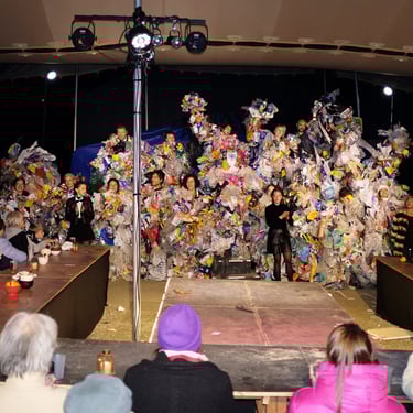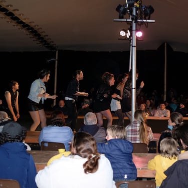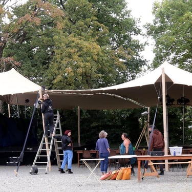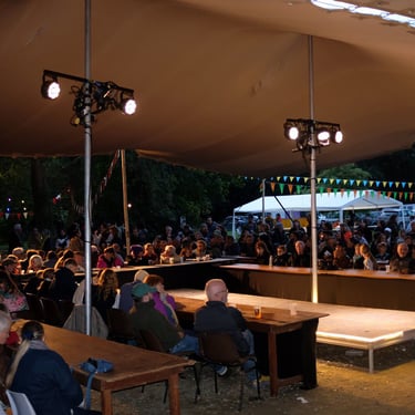 Couverture d’espace scénique et du public avec gradins grâce à une tente Stretch de 300 m². Location de tente nomade adaptée aux contraintes techniques et scénographiques, avec hauteurs possibles jusqu’à 6 mètres, pour spectacles et événements culturels.