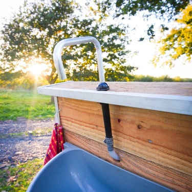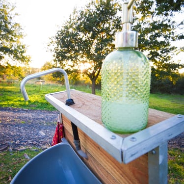 Pas besoin de raccordement au réseau d’eau : notre lave-mains fonctionne avec une pompe à pied.