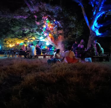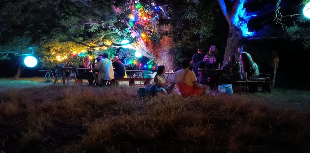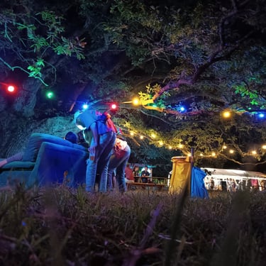 Les guirlandes guinguette LED, en blanc chaud ou en version multicolore (rouge, bleu, vert, jaune), permettent de créer une ambiance chaleureuse et festive, idéale pour les zones de restauration, de détente ou d’accueil du public. Leur lumière douce structure l’espace sans l’écraser, tout en mettant en valeur la toile et ses formes.