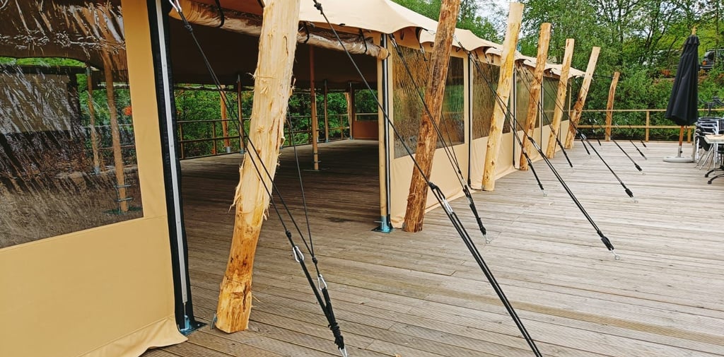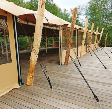 Ces parois transparentes ferment la structure tout en laissant passer la lumière naturelle. Elles offrent une excellente protection sans alourdir visuellement la tente, ce qui permet de maintenir une ambiance lumineuse et agréable, même par mauvais temps.